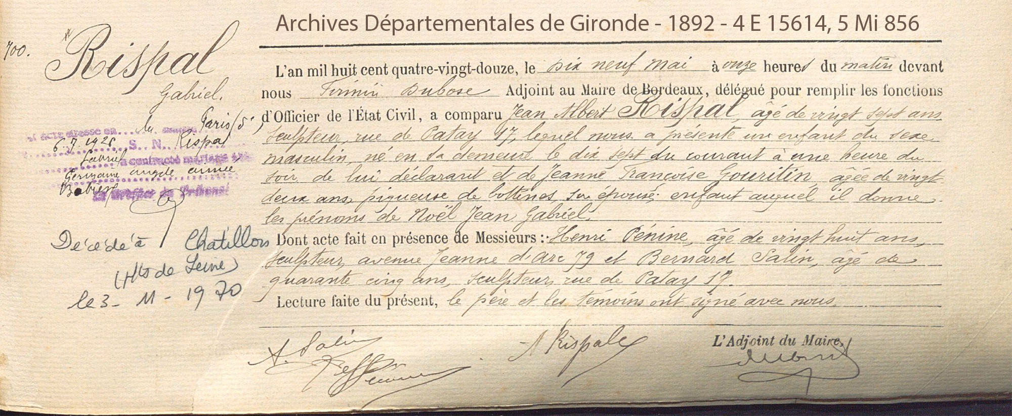 Gabriel Rispal est né à Bordeaux le 17 mai 1892. Il fut imprégné de sculpture dès son plus jeune âge ; son père, Jean Albert(i), étant lui-même sculpteur de profession. Il débuta ainsi tout naturellement son métier de sculpteur dans l’atelier de son père.