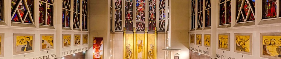 La nef et le chœur heptagonal sont éclairés par de grandes verrières colorées, qui occupent tout l’espace mural entre les points d’appui et font de cette église un immense espace de verre.