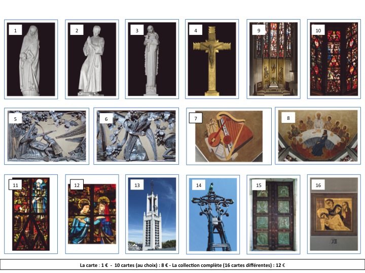 Collection de 16 cartes postales de grande qualité disponibles dans l’église.